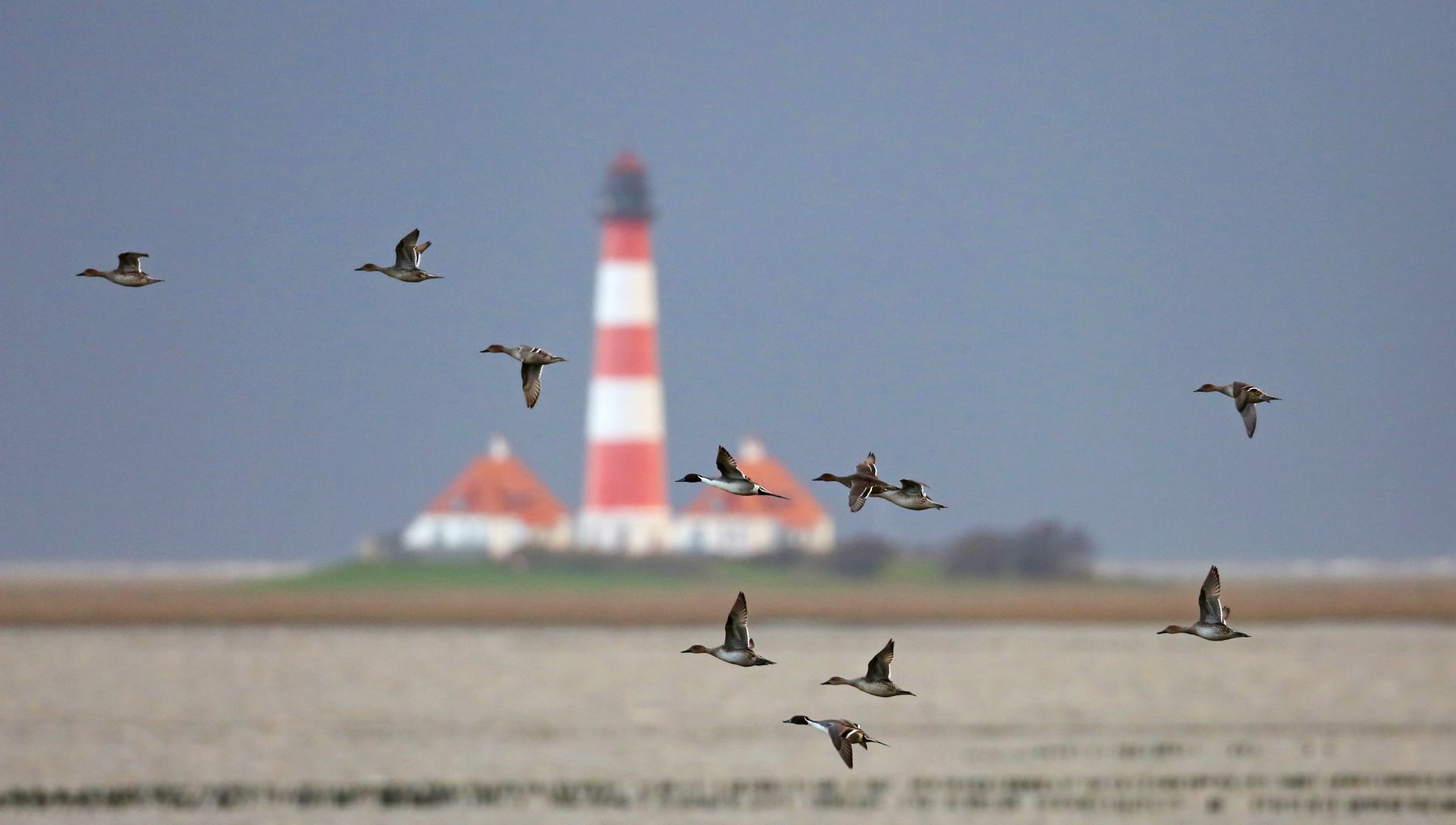 Spiessenten vor einem Leuchtturm an der Nordsee: TK